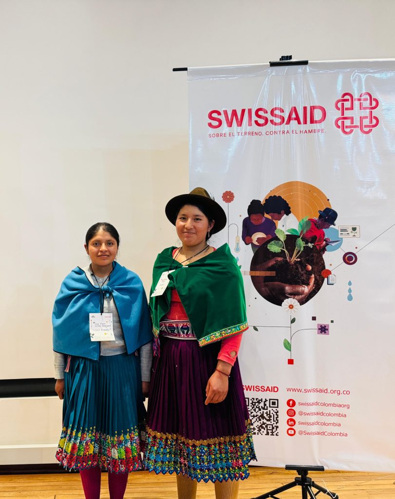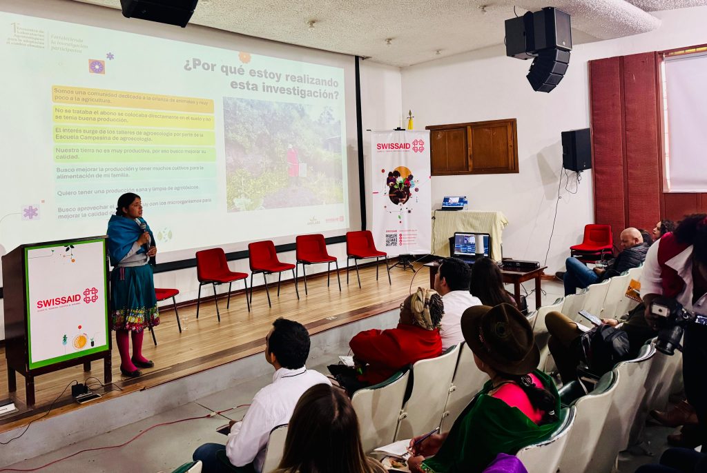 A continuación, se llevó a cabo el foro de investigaciones participativas sobre el cambio climático, al cual fueron invitadas varias personas que realizan investigaciones en sus territorios. Dentro de este panel participaron dos mujeres campesinas indígenas de Chimborazo, agricultoras investigadoras y parte del proyecto Aed Labs en Swissaid Ecuador (ejecutado por Swissaid Colombia y Ecuador). Ellas fueron invitadas a comentar sobre su proceso de investigación, sus avances y los resultados obtenidos hasta la fecha.