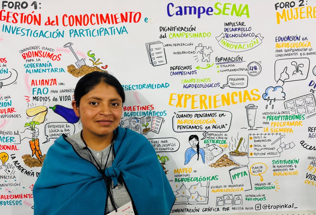 Una de las panelistas invitadas de Ecuador fue Clara Ushca, de la comunidad Chipcha, perteneciente a la nacionalidad Puruhá, ubicada a 3.400 m s.n.m., en la provincia de Chimborazo. Durante su presentación habló sobre su investigación, centrada en el uso de microorganismos para mejorar el abono de cuy. Mencionó cómo la agroecología le ayudó a mejorar sus cultivos, pero también despertó en ella la curiosidad sobre los microorganismos y sus múltiples usos. Se propuso mejorar el abono de cuy con microorganismos para obtener mejores resultados, destacando que una de las principales razones es mejorar el suelo para lograr una mejor producción, algo que está alcanzando mediante esta práctica.